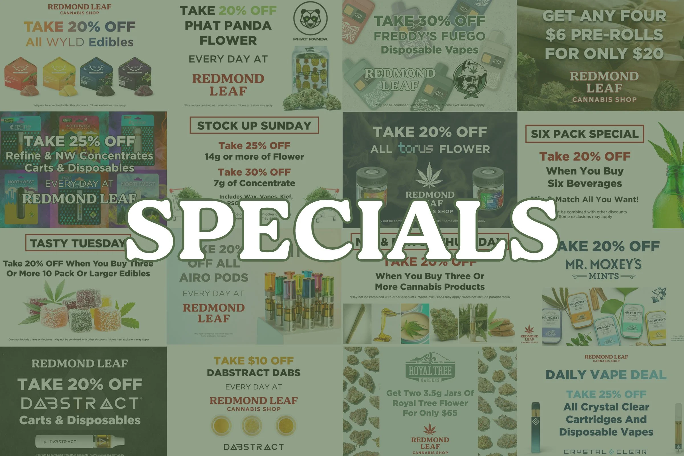 THE BESTSERVICE, SELECTION, SPECIALS, AND PARKING ON THE EASTSIDE ORDER ONLINE ORDER ONLINE HOWEVER YOU LIKE TO CONSUME CANNABIS, REDMOND LEAF HAS A DAILY OR WEEKLY SPECIAL FOR YOU join redmond leaf loyalty and earn up to 30% OFF CERTIFIED MEDICAL CANNABIS PATIENTS CAN SAVE UP TO 47%